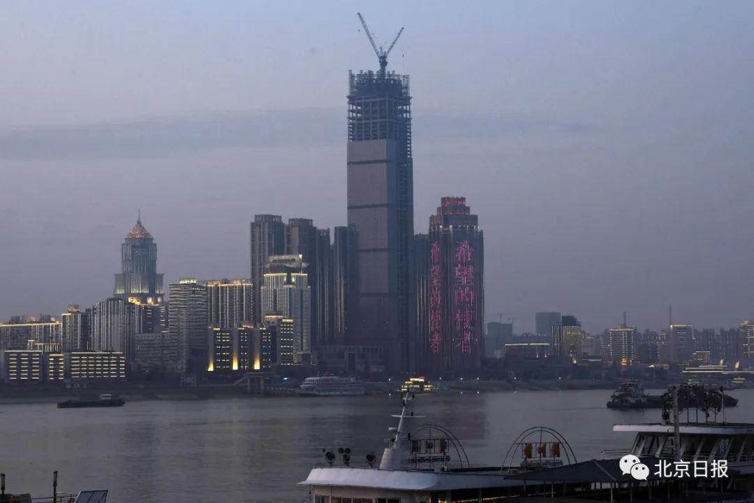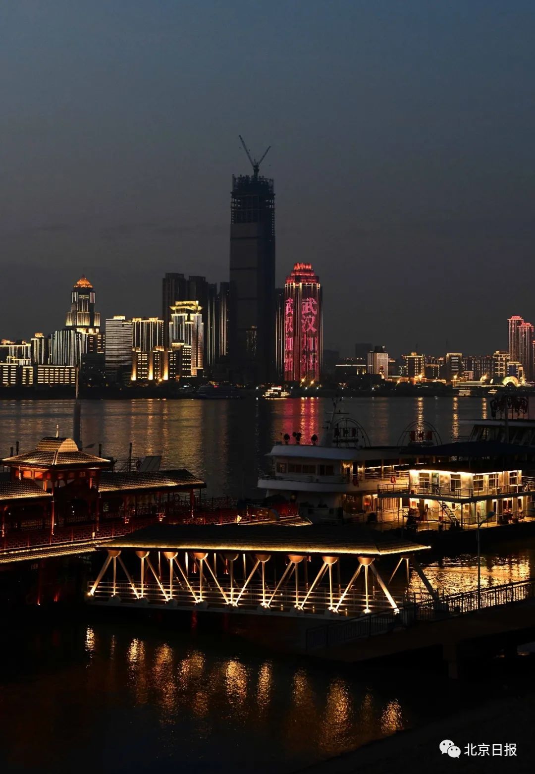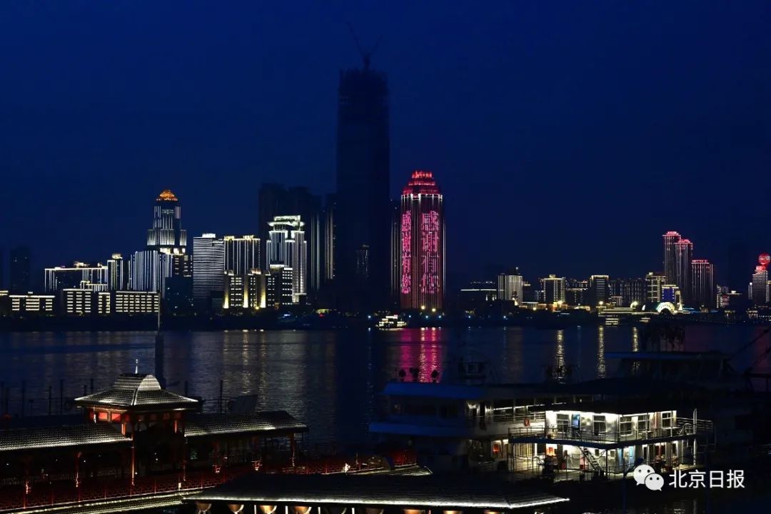 今天傍晚,几抹晚霞擦亮了武汉的天空,随着夜幕降临,长江两岸多处地标建筑外立面灯光亮起,一条条感人的红色灯光字幕缓缓打出———